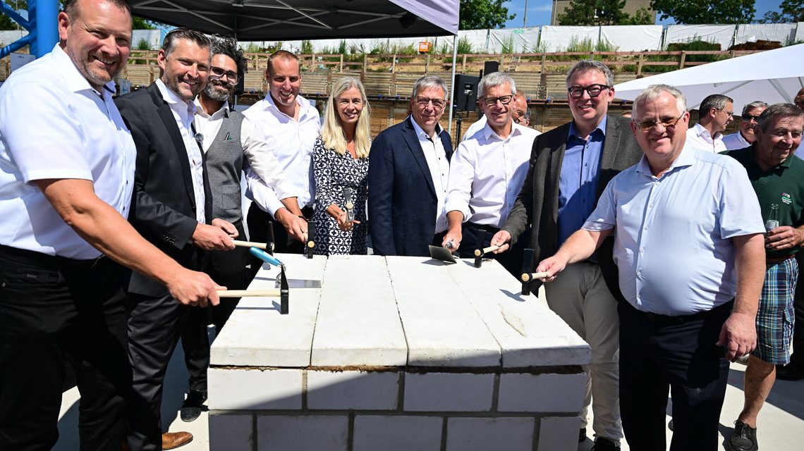 Der Mörtel zum Verschließen der Grundsteinplatte mischte sich mit Begeisterung, Visionen mit Vereinsarbeit – und sogar die Sonne kam pünktlich hervor, als Oberbürgermeister Gert-Uwe Mende heute, am 7. August, mit Stadtpolitik und Sportfunktionären den Grundstein für den Sportpark Rheinhöhe setzte. Auf 150 Millionen Euro beläuft sich das Bauprojekt. Was entstehen soll, ist nicht weniger als ein Meilenstein der Wiesbadener Stadtentwicklung: ein moderner Sportkomplex mit Wettkampfbecken, Eishalle, Saunalandschaft und der neuen mattiaqua-Zentrale – kompakt, nachhaltig, barrierefrei.