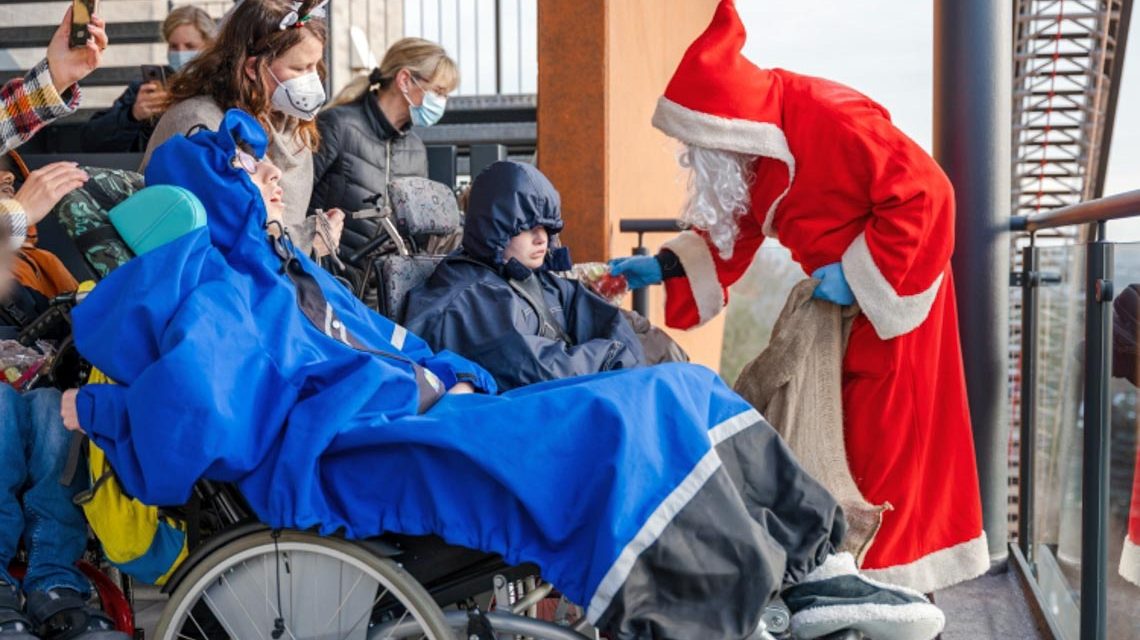 Ziel des Konvois war das Zwerg Nase Zentrum in Dotzheim, wo ganz besondere Kinder die Ankunft bereits erwarteten. Große Aufregung machte sich breit, als endlich die großen, leuchtorangenen Feuerwehrautos um die Ecke bogen. Einige der aufgeregtesten Patienten konnten das Eintreffen kaum abwarten und hatten mit Hilfe ihres Pflegepersonals bereits ihren Aussichtspunkt bezogen. Schnell hatte sich die Ankunft vom Weihnachtsmann, Rudolf und Olaf rumgesprochen und die Balkone der Einrichtung füllten sich. Die meisten der pflegebedürftigen Kinder und junger Erwachsenen saßen gut gelaunt und in dicke Decken eingewickelt in ihren Rollstühlen. Ein Patient wurde sogar im Pflegebett auf den Balkon gebracht – auch er wollte das folgende Spektakel auf keinen Fall verpassen.