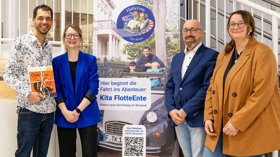 Die neue Kindertagesstätte „Flotte Ente“ im Westend ist erfolgreich gestartet. Sozialdezernentin Dr. Patricia Becher besuchte die Einrichtung gemeinsam mit Thomas Scheffler, Leiter der Abteilung Kindertagesstätten und Kindertagespflege im Amt für Soziale Arbeit, um sich vor Ort über das Raumkonzept und den Beginn des Betriebs zu informieren. Die Kita ist durch die Umnutzung eines ehemaligen Autohauses entstanden und bietet Platz für 82 Kinder im Alter von einem Jahr bis zum Schuleintritt.