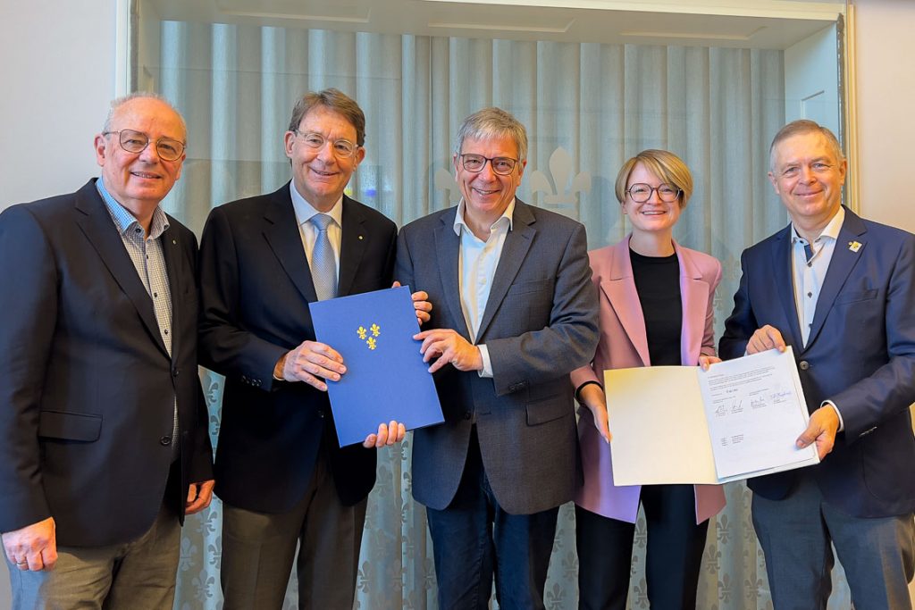 Foto – Bild von der Unterzeichnung des Schenkungsvertrags am 25.04.2024, v.l.n.r. Karl-Heinz Heuß, Dr. Hoiko de Pay, OB Gert-Uwe Mende, Dr. Patricia Becher, Dr. Alfred Rau ©2024 Lions