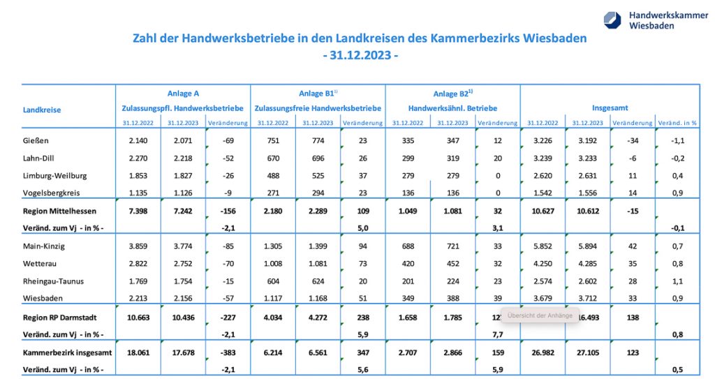 Hinsichtlich der Entwicklung der Betriebszahlen gibt es in den jeweiligen Landkreisen im Bezirk der Handwerkskammer Wiesbaden regionale Schwankungen. Während es in 2023 unter anderem im Landkreis Gießen einen Rückgang von 34 Betrieben (-1,1 Prozent) auf insgesamt 3.192 gab, konnte ein Anstieg um 28 Betriebe (+1,1 Prozent) auf insgesamt 2.602 im Rheingau-Taunus-Kreis sowie in der Landeshauptstadt Wiesbaden (kreisfreie Stadt) um 33 Betriebe (+0,9 Prozent) auf insgesamt 3.712 verzeichnet werden.