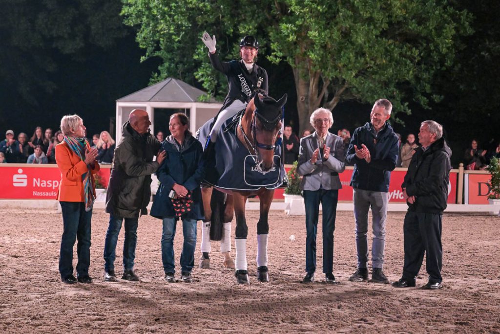 Werth, die nun neunmalige Rekord-Kür-Siegerin von Wiesbaden und Emilio, der zum zweiten Mal in Wiesbaden war, und zum zweiten Mal mit seiner italienischen Opernmusik die Zuschauer verzückte, wann am Sonntagabend die Flutlicht-Kür im Wiesbadener Schosspark. Das Schloss, das Flutlicht, 8.000 Zuschauer – es war die perfekte Kulisse für einen Kürabend und bedeutenden Moment des Abschieds. Er hat sich hier heute frisch und munter gezeigt, lachte Werth über weitere kleine Buckeleinheiten Emilios in der Ehrenrunde. Ich bin sehr stolz auf ihn! Und er hat es verdient, sich vor einer so großartigen Kulisse zu verabschieden.