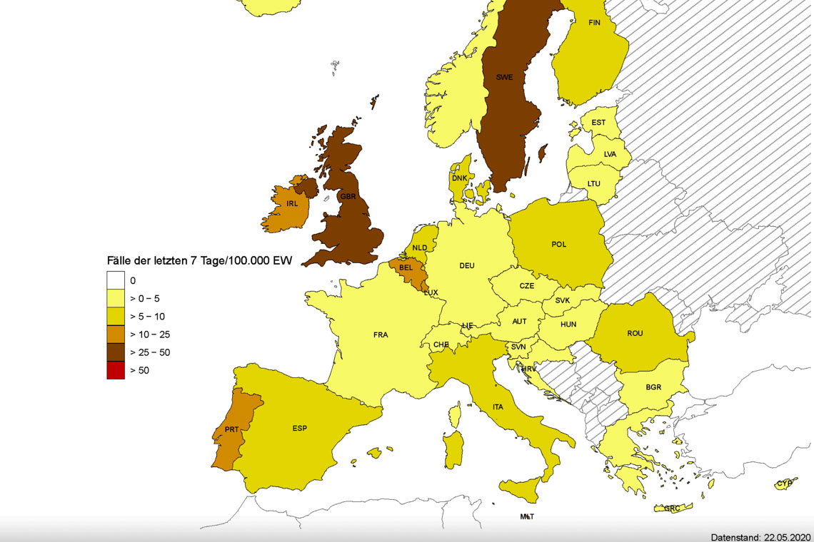 Das Robert Koch-Institut (RKI) hat am vergangenen Wochenende, 16./17. Mai, neue Empfehlungen zur Anordnung von Quarantäne bei Einreisen nach Deutschland herausgegeben. In dem am 22. Mai auf der Internetseite des RKI Text heißt es, dass für Einreisen nach mehrtägigem Aufenthalt in einem EU-Mitgliedsstaat, einem Schengen-assoziierten Staat oder dem Vereinigten Königreich von Großbritannien und Nordirland nur noch dann die Quarantäne anzuraten sei, wenn der jeweilige Staat nach den statistischen Auswertungen und Veröffentlichungen des European Center for Disease Prevention and Control (ECDC) eine hohe Neuinfiziertenzahl im Verhältnis zur Bevölkerung aufweise. Als Faustregel gelte: mehr als 50 Fälle pro 100 000 Einwohner kumulativ in den letzten sieben Tagen.