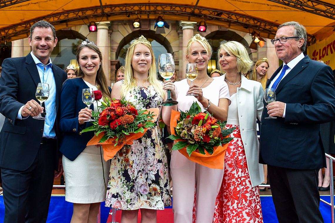 Babette von Kienlin moderiert die Eröffnungszeremonie der 42. Rheingauer Weinwochen die am 11. August traditinell mit dem Einlauf der Weinköniginnen von Oberbürgermeister Sven Gerich und Wirschaftsdezernent Detlef Bendel eröffnet wurden. Bild: Volker Watschounek