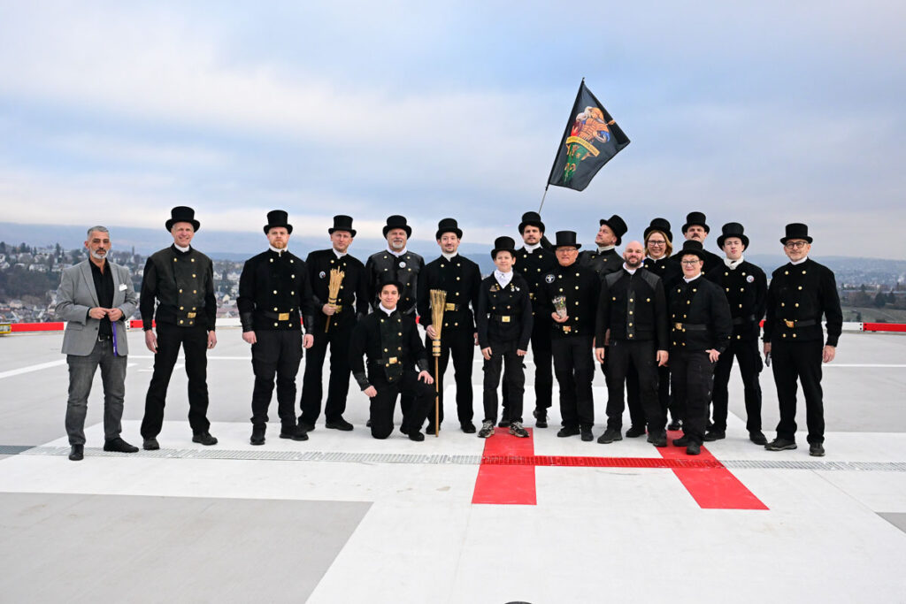 Der Rundgang führt diesmal auch zu einem Ort, den bisher keiner der Schornsteinfeger betreten hat: den neuen Hubschrauberlandeplatz der HSK. Auch wenn die Gruppe nicht per Helikopter einfliegt, wächst die Vorfreude spürbar, als sich die Türen zum Dach öffnen. Ein kalter Wind greift nach den Zylindern, die Stadt liegt unter ihnen, und der besondere Augenblicks erreicht jeden Einzelnen.